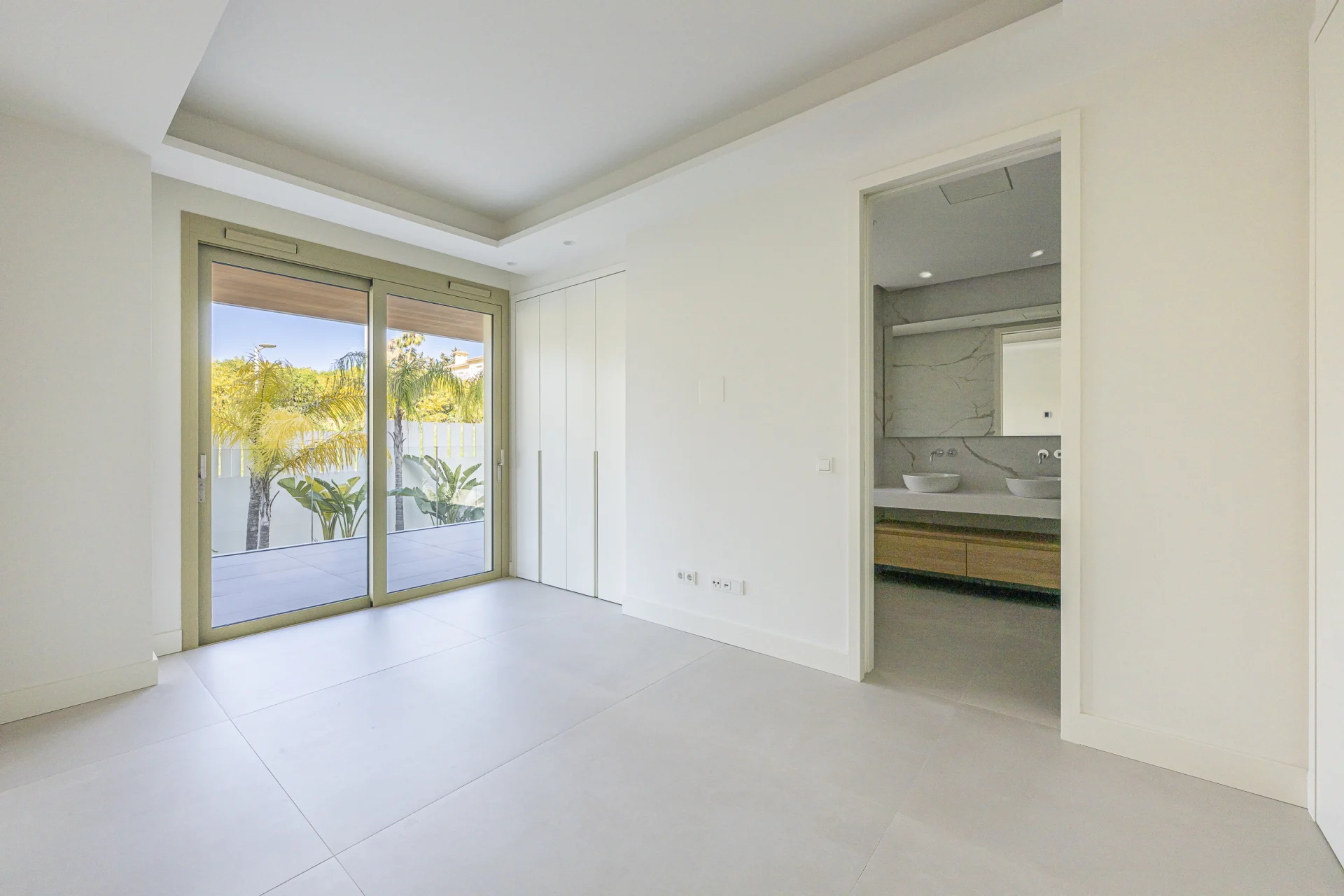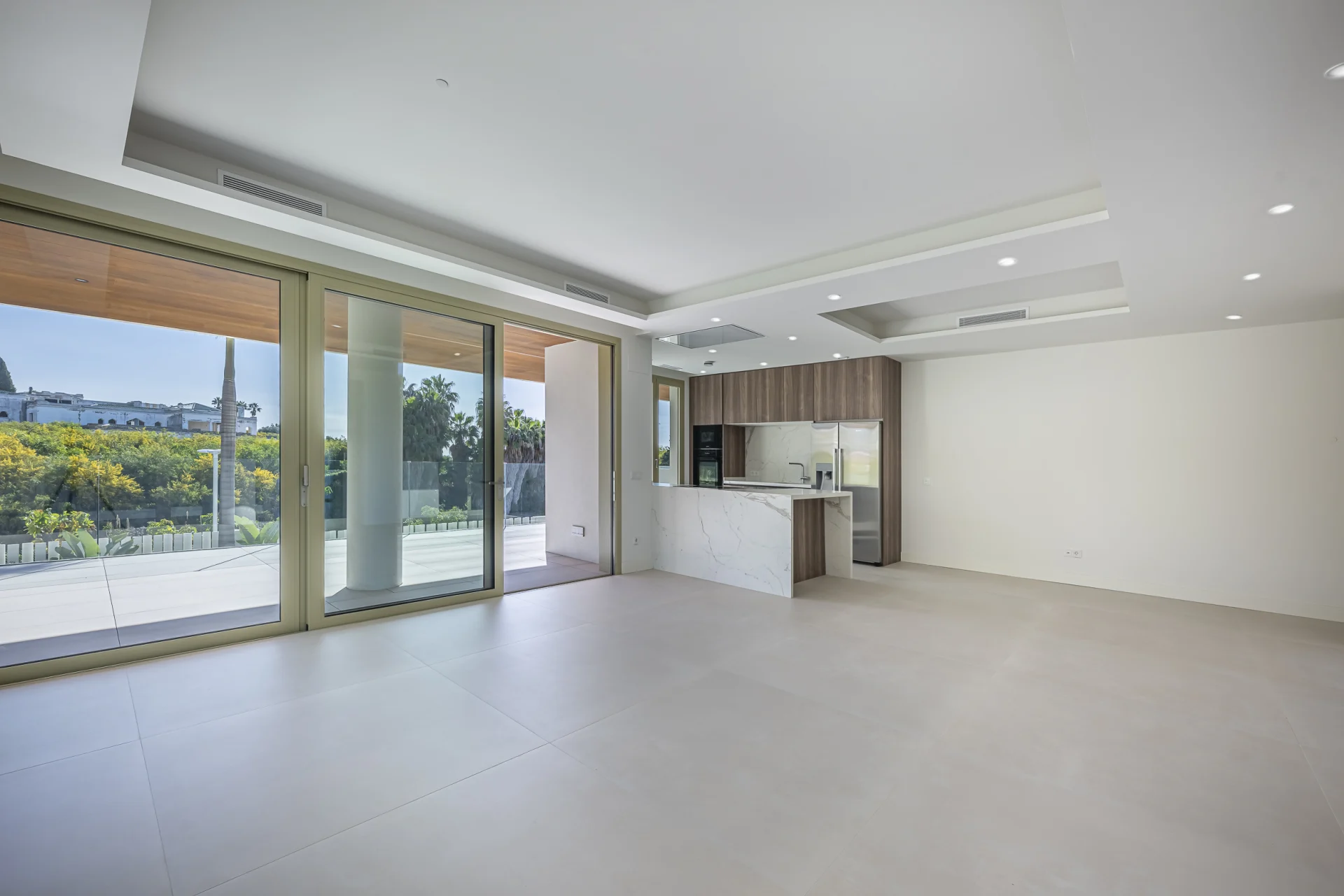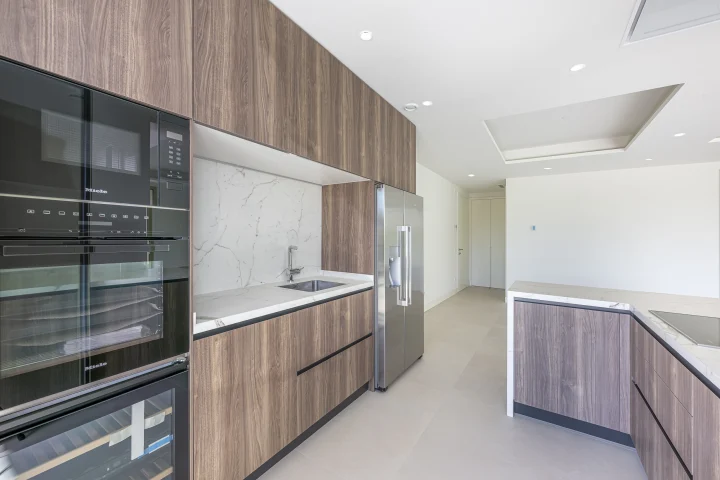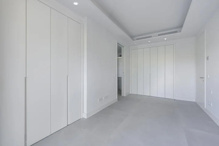 The interior is laid out on a single level and comprises a bright living room with direct access to the terrace, a fully fitted kitchen, and two well-proportioned bedrooms, including a master suite with en-suite bathroom and walk-in closet. Finishes include marble floors, air conditioning, double glazing, and electric blinds, ensuring year-round comfort.