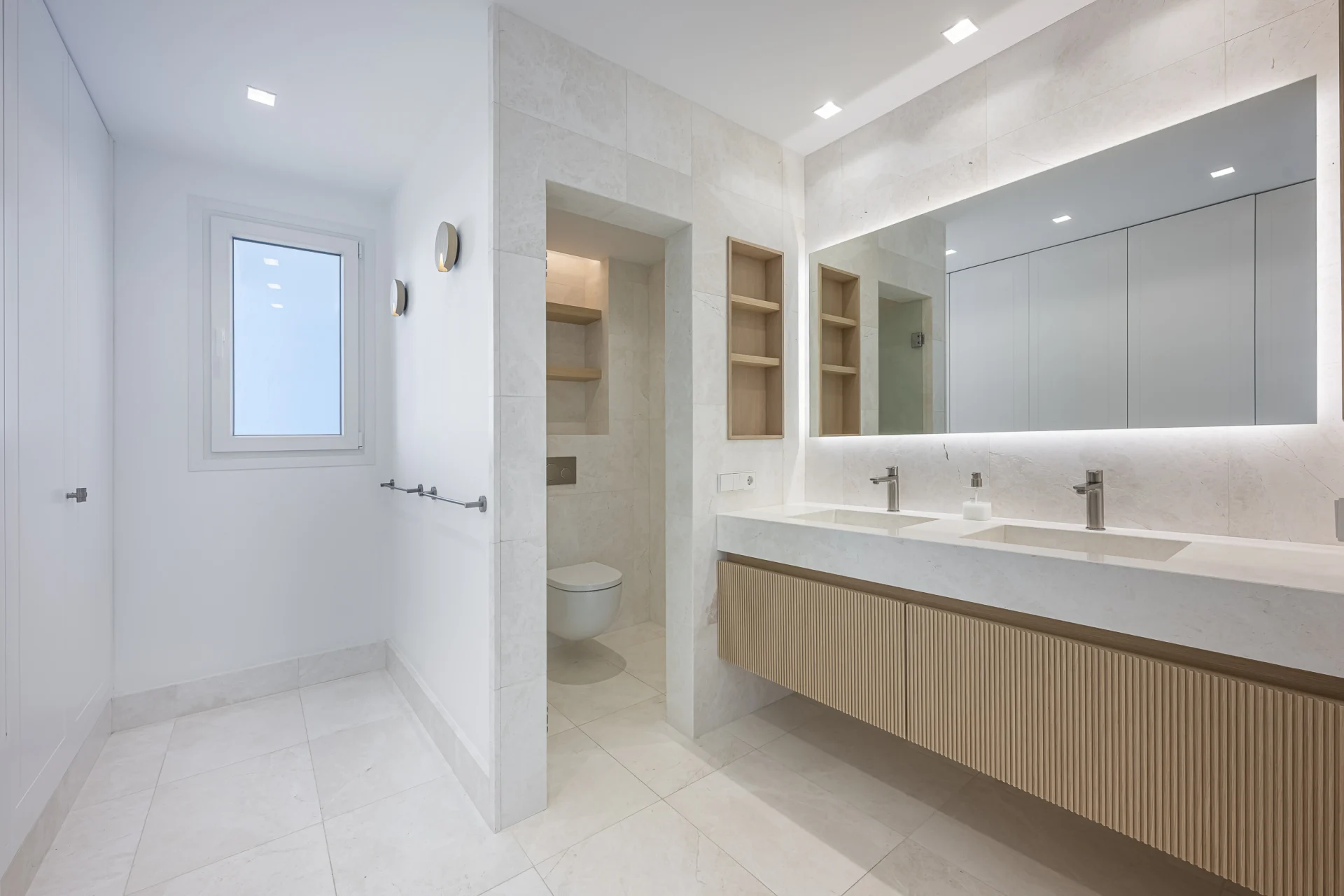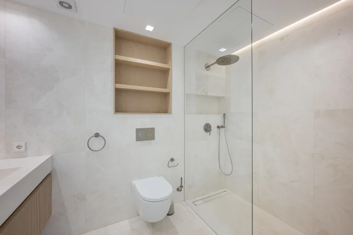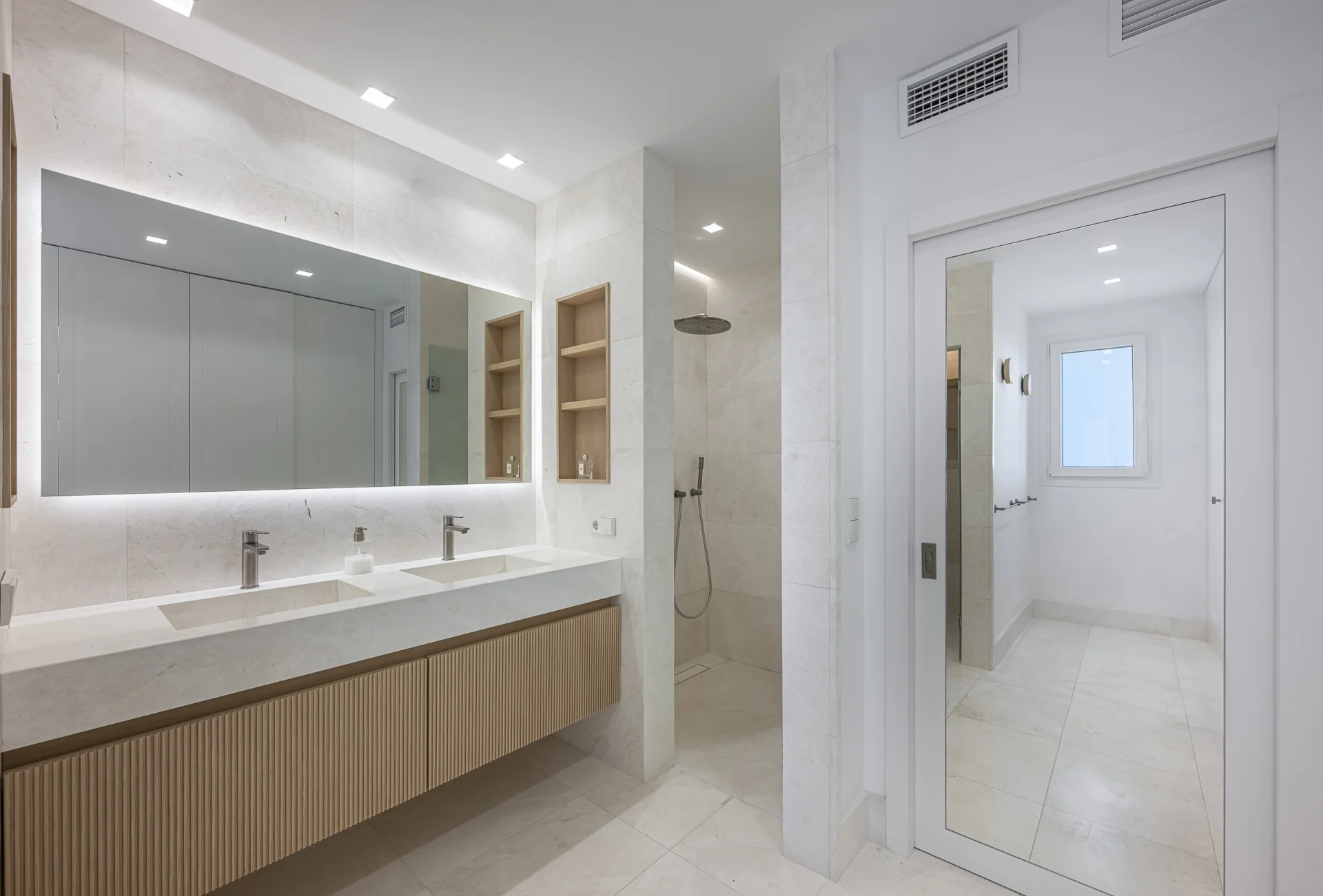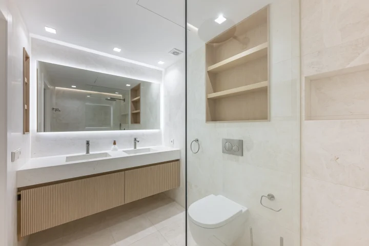 The master bedroom boasts direct access to the terrace and an en-suite bathroom featuring a walk-in shower and double vanity. The second bedroom includes fitted wardrobes and a separate full bathroom, both equipped with a walk-in shower and double vanity.