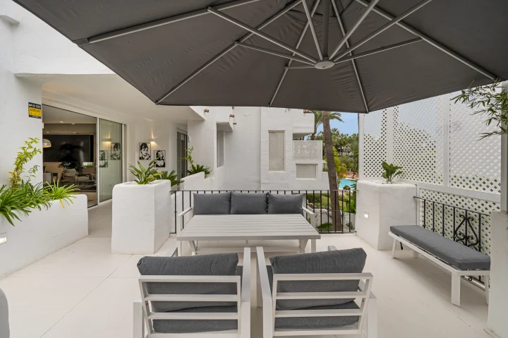 Step outside onto one of the apartment’s two large terraces, which feature both covered and uncovered areas, and enjoy the refreshing breeze and serene surroundings. Whether it’s outdoor dining, sunbathing, or simply unwinding with a good book, these terraces offer the perfect retreat to enjoy Marbella’s unique climate.