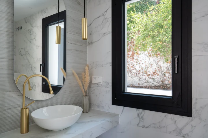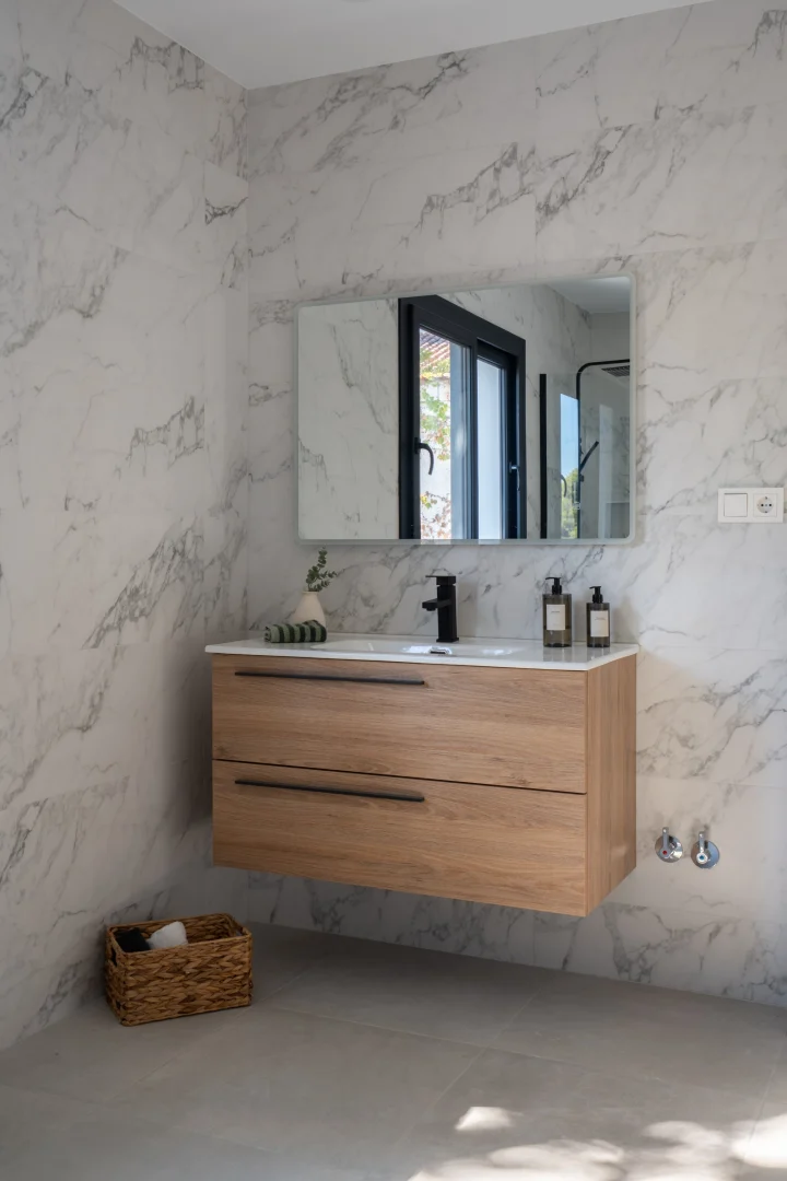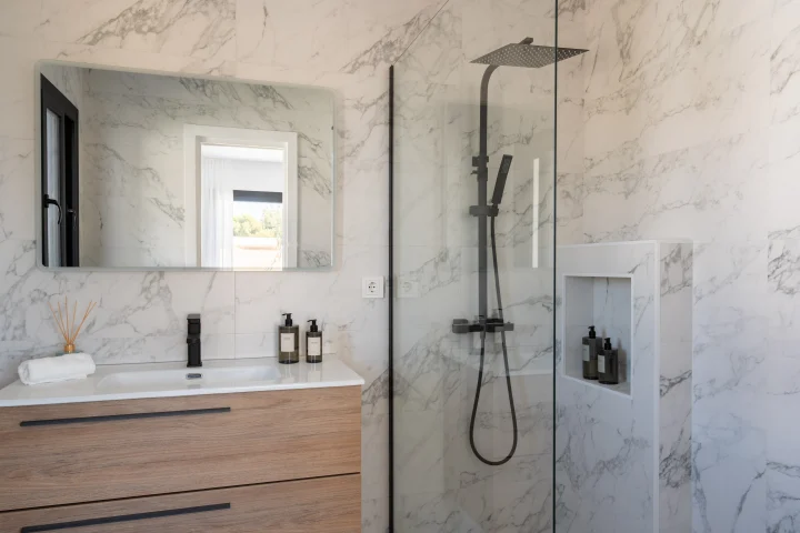 With its southwest orientation, the villa is bathed in natural light throughout the day, creating a warm and inviting atmosphere both indoors and out. From the partially elevated position, you can enjoy serene and partial views of the sea while still being just a short stroll from a wide selection of restaurants, cafés, and supermarkets.